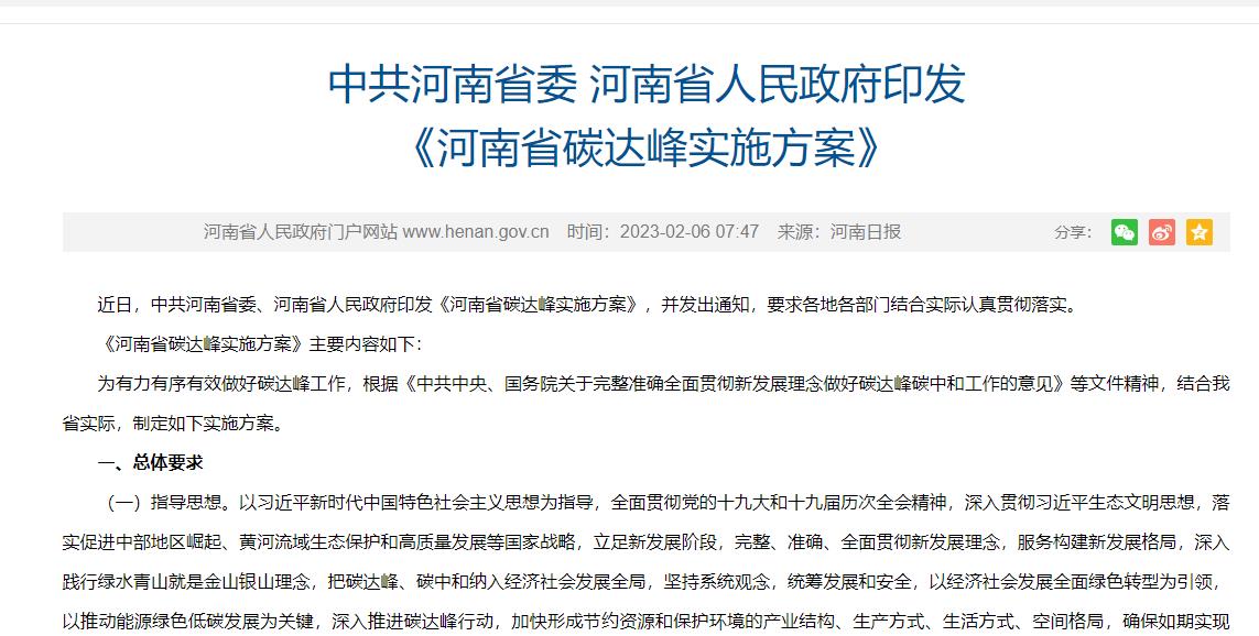 氫啟未來網獲悉,近日,河南省人民政府印發《河南省碳達峰實施方案》