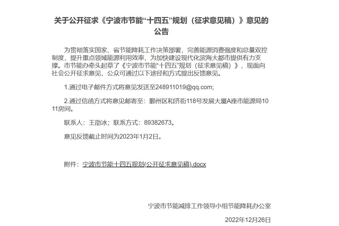 氫啟未來網獲悉,12月26日,寧波市節能減排工作領導小組節能降耗辦公室發布《寧波市節能“十四五”規劃(征求意見稿)》