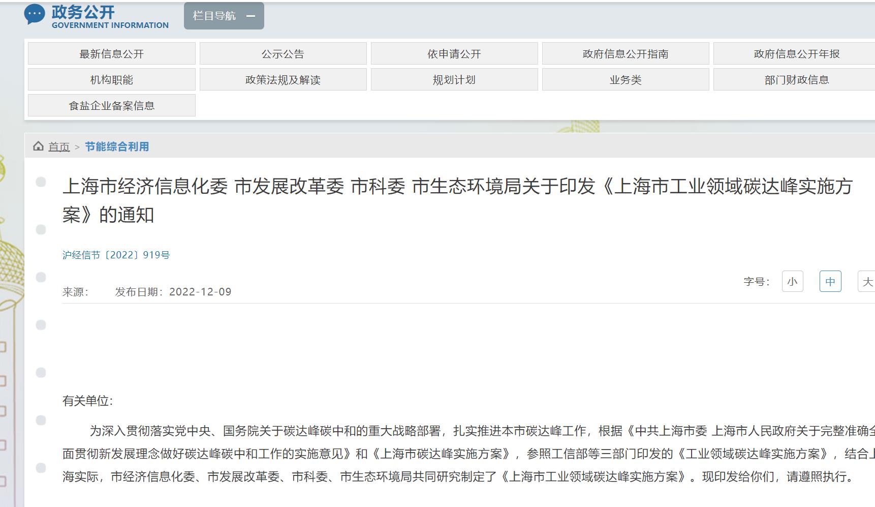 氫啟未來網獲悉,12月9日,上海市經濟和信息化委員會、上海市發展和改革委員會、上海市科學技術委員會、上海市生態環境局四部門聯合發布《上海市工業領域碳達峰實施方案》