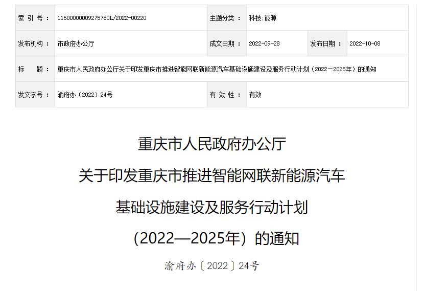氫啟未來網獲悉,日前,重慶市人民政府印發《重慶市推進智能網聯新能源汽車基礎設施建設及服務行動計劃(2022—2025年)》