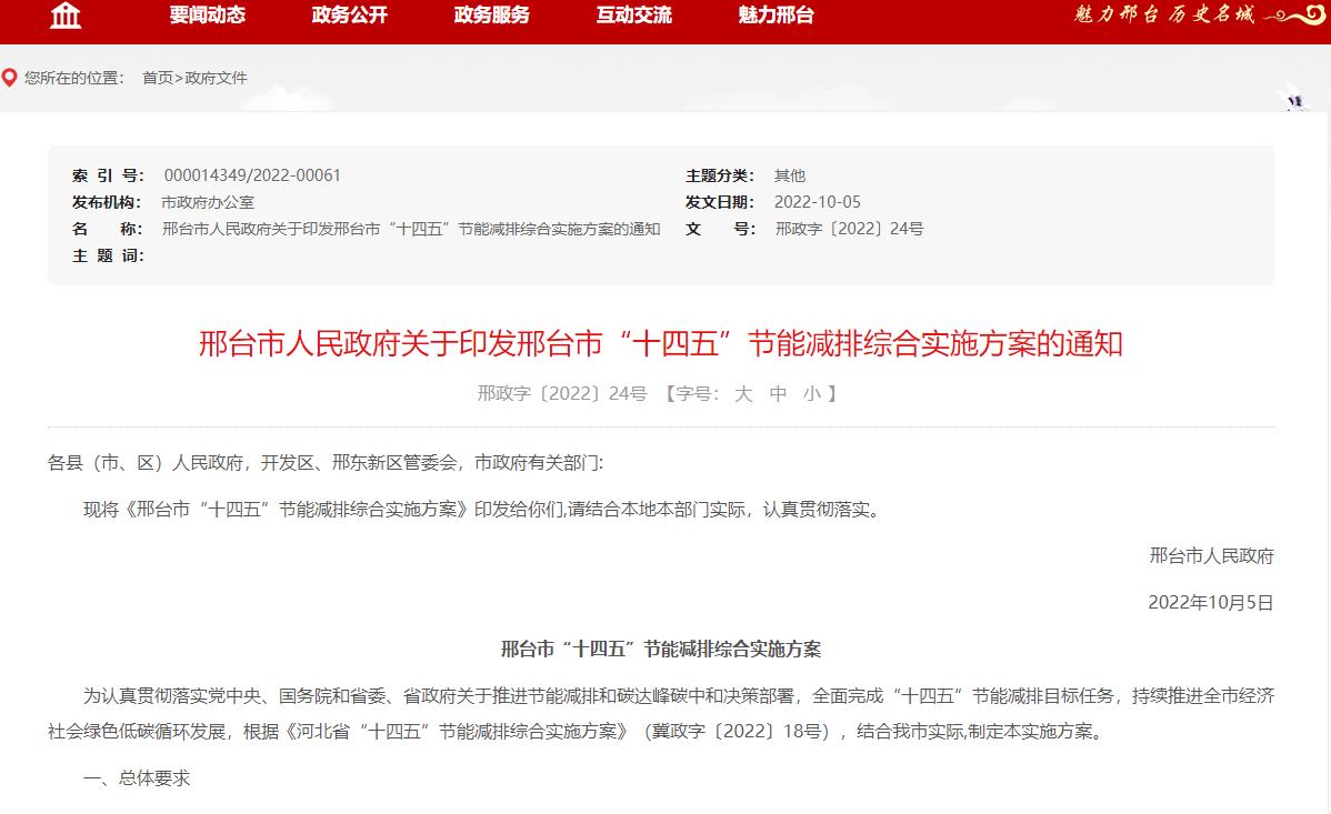 10月5日,邢臺市人民政府發布關于印發邢臺市“十四五”節能減排綜合實施方案的通知