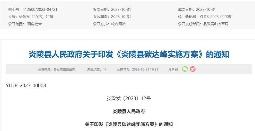 10月31日,湖南株洲炎陵縣在其官網發布了關于印發《炎陵縣碳達峰實施方案》的通知。
