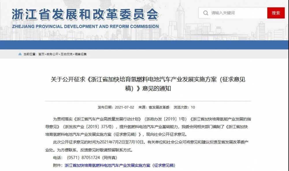 7月2日,浙江省發改委發布《浙江省加快培育氫燃料電池汽車產業發展實施方案(征求意見稿)》,此次公開征求意見的時間為2021年7月2日至7月10日。