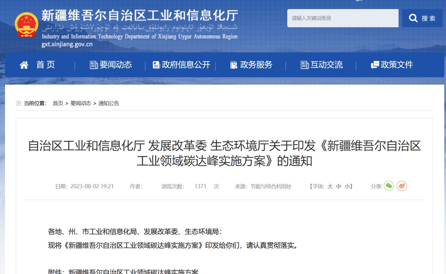 《新疆維吾爾自治區工業領域碳達峰實施方案》