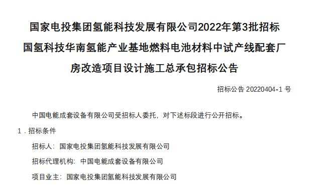 近日,國家電投集團(tuán)氫能科技發(fā)展有限公司2022年第3批招標(biāo),國氫科技華南氫能產(chǎn)業(yè)基地燃料電池材料中試產(chǎn)線配套廠房改造項(xiàng)目設(shè)計施工總承包招標(biāo)公告發(fā)布。