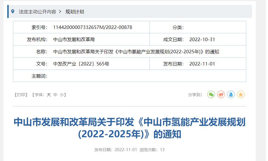 氫啟未來網(wǎng)獲悉,11月1日,中山市發(fā)展和改革局公布關(guān)于印發(fā)《中山市氫能產(chǎn)業(yè)發(fā)展規(guī)劃(2022-2025年)》的通知。