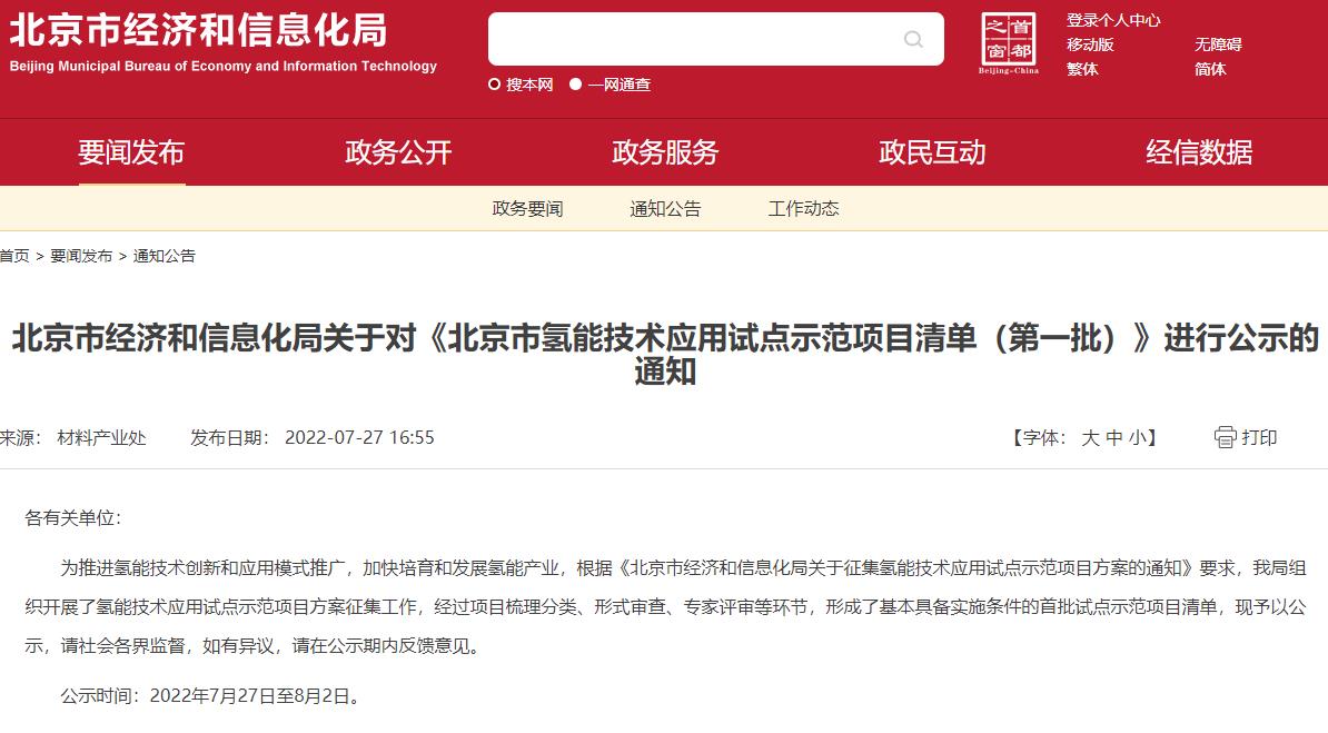 氫啟未來(lái)網(wǎng)獲悉,7月27日,北京市經(jīng)信局對(duì)《北京市氫能技術(shù)應(yīng)用試點(diǎn)示范項(xiàng)目清單(第一批)》進(jìn)行公示通知