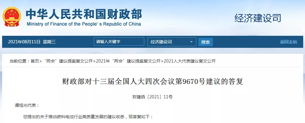 財政部近日對人大代表的建議提案進行了回復(fù)。在這些提案中,部分人大代表提出將山東省、成渝市、內(nèi)蒙古包頭市納入燃料電池示范城市群的建議。