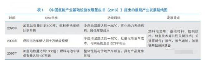 在氫能和燃料電池發(fā)展這方面,在我國(guó)也始終不掉隊(duì)。16年10月,中國(guó)標(biāo)準(zhǔn)化研究院資源與環(huán)境分院和中國(guó)電器工業(yè)協(xié)會(huì)公布的《中國(guó)氫能產(chǎn)業(yè)基礎(chǔ)設(shè)施發(fā)展藍(lán)皮書(2016)》第一次明確指出了在我國(guó)氫能產(chǎn)業(yè)的發(fā)展路線圖(表1)。對(duì)在我國(guó)中長(zhǎng)期加氫站和燃料電池車輛發(fā)展方向做好了整體規(guī)劃。