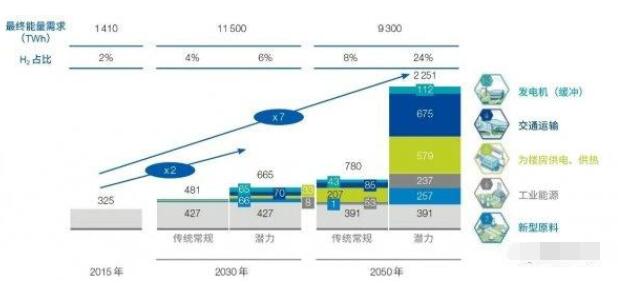 報(bào)告預(yù)測(cè)分析,到2050年,歐洲10%—18%建筑的供暖和供電能夠由氫能源提供;工業(yè)生產(chǎn)中23%的高級(jí)熱能可由氫能源提供。