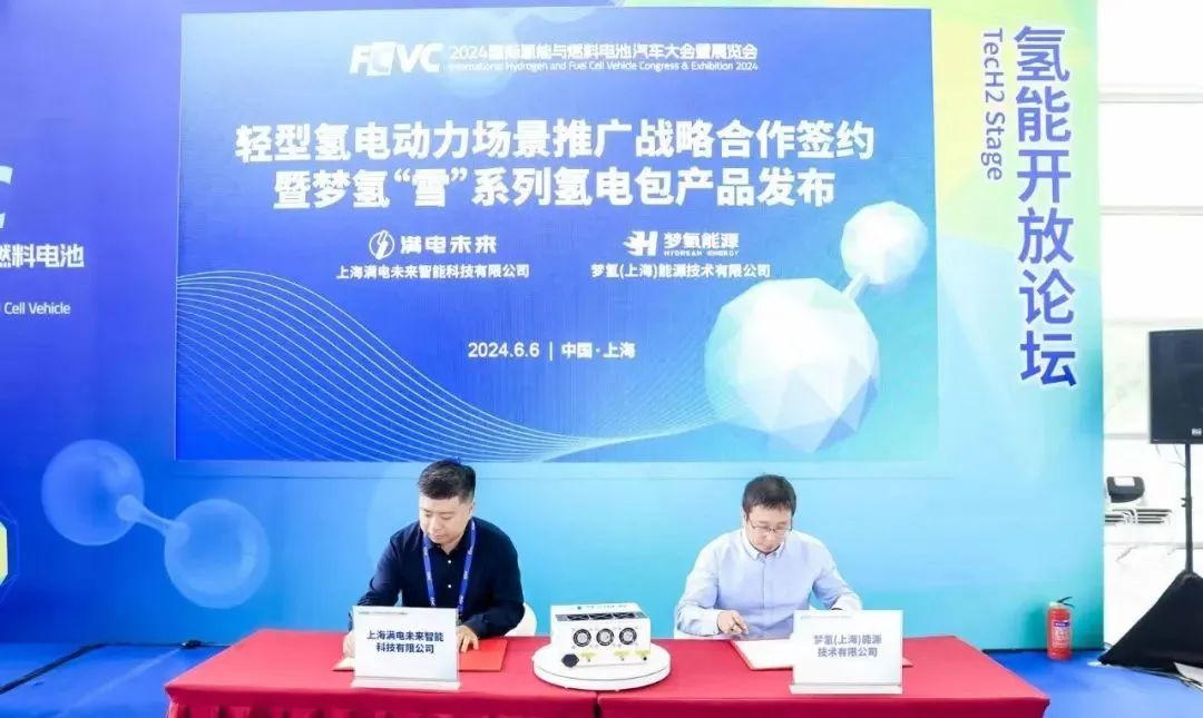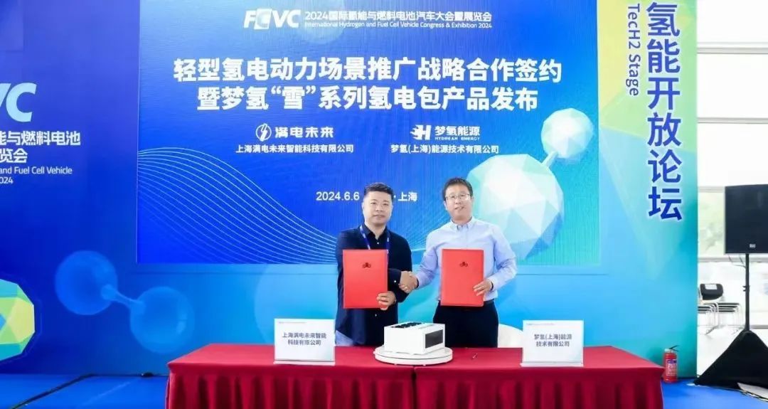 6月6日,在上海汽車會展中心召開的,由中國汽車工程學(xué)會與國際氫能燃料電池協(xié)會共同主辦的“2024國際氫能與燃料電池汽車大會暨展覽會(FCVC 2024)上,夢氫能源與滿電未來就輕型氫電動力應(yīng)用場景推廣,進(jìn)行了戰(zhàn)略合作簽約暨夢氫“雪系列”空冷氫電包發(fā)布會,夢氫能源董事長張亮和滿電未來執(zhí)行總裁王強(qiáng)出席了簽約儀式。