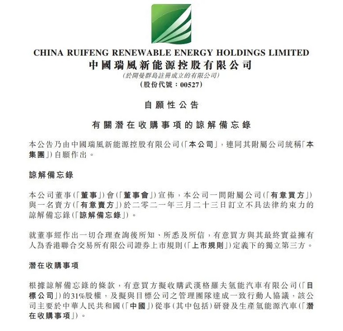 昨日晚間,瑞風新能源(00527.HK)發(fā)布公告稱,公司一間附屬公司與一名賣方(“有意賣方”)于2021年3月23日訂立不具法律約束力的諒解備忘錄。