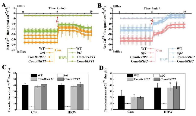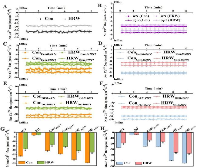 通過Cd(鎘)濃度,Cd2+熒光染色,NMT(非損傷微測技術)對Cd吸收進行分析,結果表明,HRW(hydrogen-rich water,富氫水)在降低小白菜幼苗根部對Cd的吸收方面具有顯著的積極作用。BcIRT1(鐵調節轉運蛋白1)和BcZIP2(鋅調節轉運蛋白2)是小白菜中主要的Cd轉運蛋白,但它們在HRW減少Cd吸收過程中的作用仍然未知。本研究驗證了IRT1和ZIP2在白菜和擬南芥中HRW減少Cd吸收中的功能。在擬南芥中的異源和同源表達表明,HRW顯著降低了野生型(Col-0)和轉基因擬南芥IRT1和ZIP2中的Cd含量,但irt1和zip2突變體除外。NMT檢測表明,HRW不僅降低了Cd2+在WT和轉基因株系根部的內流,而且增強了Zn和Cd之間的競爭。綜合來看,HRW誘導的植物Cd積累減少可能是通過抑制BcIRT1和BcZIP2的表達,影響BcIRT1和BcZIP2對離子吸收的偏好性導致的。