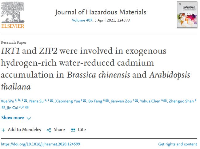標題:IRT1and ZIP2were involved in exogenous hydrogen-rich water-reduced cadmium accumulation in Brassica chinensisand Arabidopsis thaliana