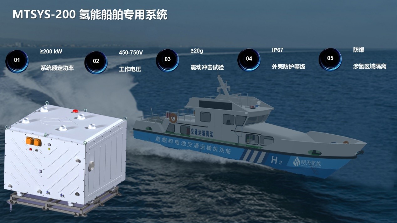 氫能船舶具有零碳環保、能量轉化效率高、模塊化程度高、運行噪音低和維修成本低等優勢,已成為新能源船舶的主要研發與產業化方向。明天氫能公司成立以來,不斷拓展燃料電池示范應用場景,高度重視氫能船舶動力開發與場景示范。2024世界制造業大會,明天氫能發布新一代200kW級船舶專用燃料電池系統,在船用燃料電池高性能膜電極、長壽命雙極板、高比功率電堆及船用動力系統的控制模塊與軟件系統的設計方面,全面迭代升級。