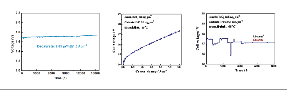 氫銳科技采用卷對卷批量制備,膜電極活性面積可達4000cm2,貴金屬用量1.1 mg/cm2、涂布厚度控制精度≤ ±2%、催化劑擔載量偏差≤ 2.4%、性能優(1.71 V@2.0 A cm-2)、一致性好(批次極差≤10mV)、長壽命(設計壽命≥100,000 h,實測≤1 μV/h@8000h)。