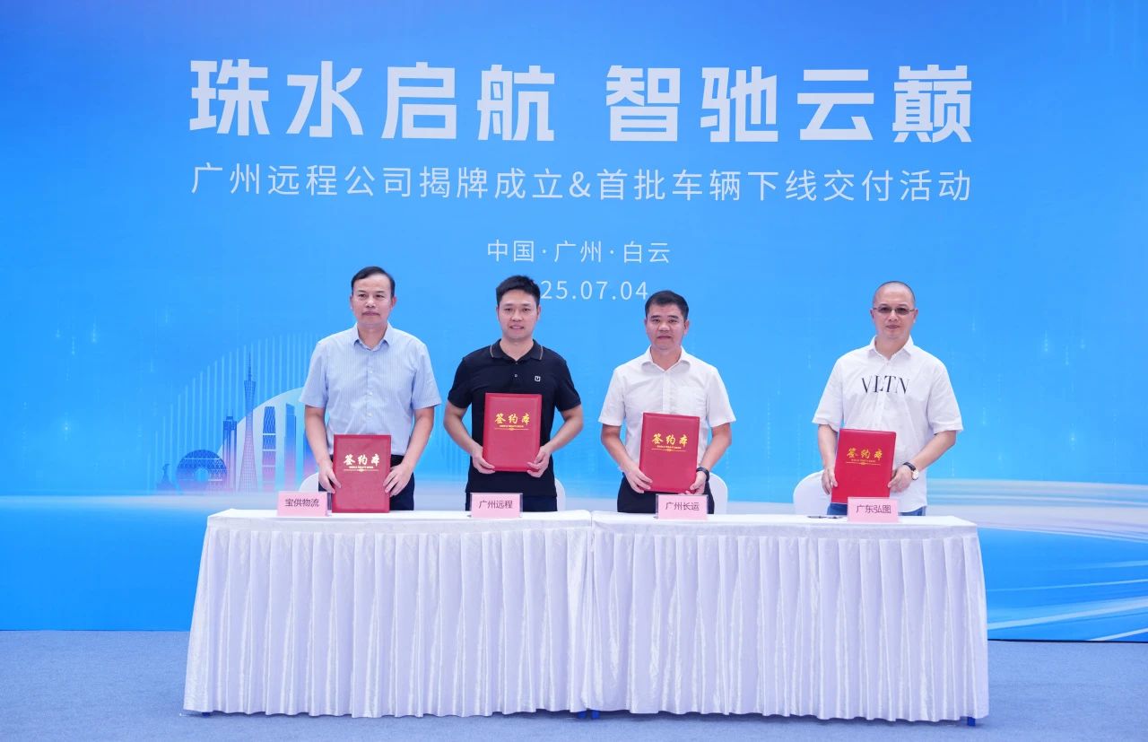 廣州市是遠程新能源商用車集團深耕華南市場的戰略支點,2024年8月遠程新能源商用車集團與廣州市白云區人民政府簽署合作協議,全力推動公交、出租、環衛、郵政、城市物流配送、特定場景用重型貨車等公共領域用車全面新能源化,共建醇氫電動汽車推廣應用示范區。此次廣州遠程新能源商用車公司的落戶和首批車輛交付,正是雙方合作的順利開局?;顒蝇F場,廣州遠程與廣州弘圖物流有限公司、廣州長運集團有限公司、寶供物流企業集團有限公司三家企業進行簽約,廣州遠程將協助簽約合作伙伴共同推動綠色物流轉型。