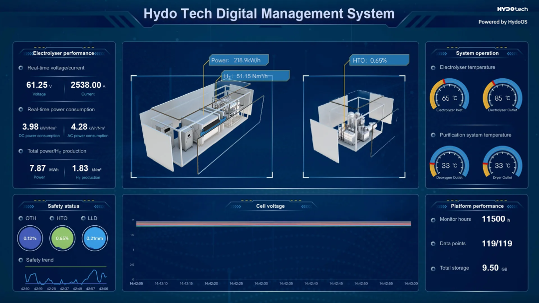 優(yōu)越性能之外,HydoLyser?更是數(shù)字原生的制氫系統(tǒng)。結(jié)合HydoLyser?插片式構(gòu)型與自研HydoOS?綠氫智能管理系統(tǒng),海德氫能為客戶打造覆蓋全生命周期內(nèi)的電解槽健康狀態(tài)監(jiān)測(cè)與運(yùn)維服務(wù)能力,基于HydoOS? CVM技術(shù)可實(shí)時(shí)監(jiān)控單個(gè)小室的健康狀態(tài),對(duì)于已識(shí)別的故障單片可在項(xiàng)目現(xiàn)場(chǎng)12小時(shí)之內(nèi)完成快速的更換或升級(jí),并嚴(yán)格遵循石化行業(yè)標(biāo)準(zhǔn)建立了完整的現(xiàn)場(chǎng)操作流程,運(yùn)維成本降低至少90%以上,解決行業(yè)核心痛點(diǎn)。
