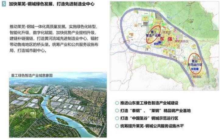方案明確了“東強(qiáng)”發(fā)展的八大重點(diǎn)板塊,其中第五板塊為加快萊蕪—鋼城綠色發(fā)展,打造先進(jìn)制造業(yè)中心。推動(dòng)萊蕪-鋼城一體化高質(zhì)量發(fā)展。實(shí)施綠色化轉(zhuǎn)型、智能化升級、數(shù)字化賦能,加快優(yōu)勢產(chǎn)業(yè)提檔升級,建鏈補(bǔ)鏈強(qiáng)鏈,打造黃河流域先進(jìn)制造業(yè)中心、輻射帶動(dòng)魯南地區(qū)的橋頭堡。統(tǒng)籌產(chǎn)業(yè)和公共服務(wù)設(shè)施布局,打造城市副中心。