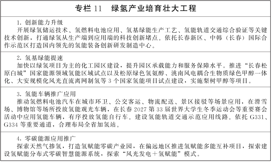 《綱要》提出創(chuàng)新能力升級、氫基綠能提速、氫能車輛推廣應(yīng)用、零碳能源應(yīng)用推廣4個綠氫產(chǎn)業(yè)培育壯大工程。其中,在氫能車輛推廣應(yīng)用中,《綱要》提到在滑雪場、博物館等場所投放氫能觀光車輛,在長春2027第33屆世界大學(xué)生冬季運(yùn)動會等重要賽會活動中應(yīng)用氫能車輛,有序投放氫能自行車。