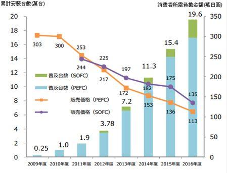 在2009年產品推廣前夕,日本政府同意每套燃料電池補貼140萬日元或者制造成本的一半,并做出補貼多年的承諾。雖然每套設備的補貼力度下降,但是總的補貼預算不斷升高。在2009年大約安裝了2300套燃料電池設備,現在這個數字已經慢慢增長至超過12000套,而每套設備的補貼則降至了500000至600000日元。而從2012年開始銷售量差不多翻倍。2015年ENE-FARM的補貼金額達到了222億日元,這一輪補貼到2016年年底已經結束。