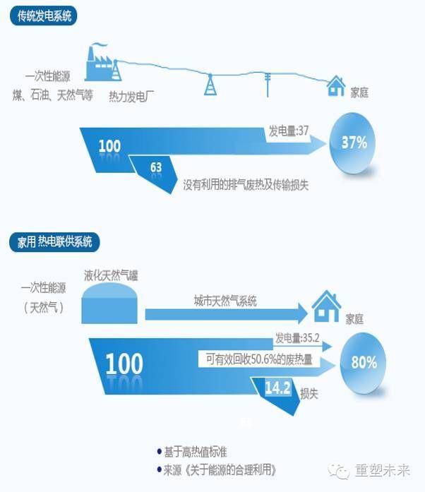 反觀家用熱電聯產系統,一次能源直接在用戶端進行能源生產,燃料電池解決了燃機小型化程度有限的問題而能夠完美地作為家用能源站的核心設備。該系統的整體熱效率高于85%,遠遠大于集中式生產的50%終端熱效率。