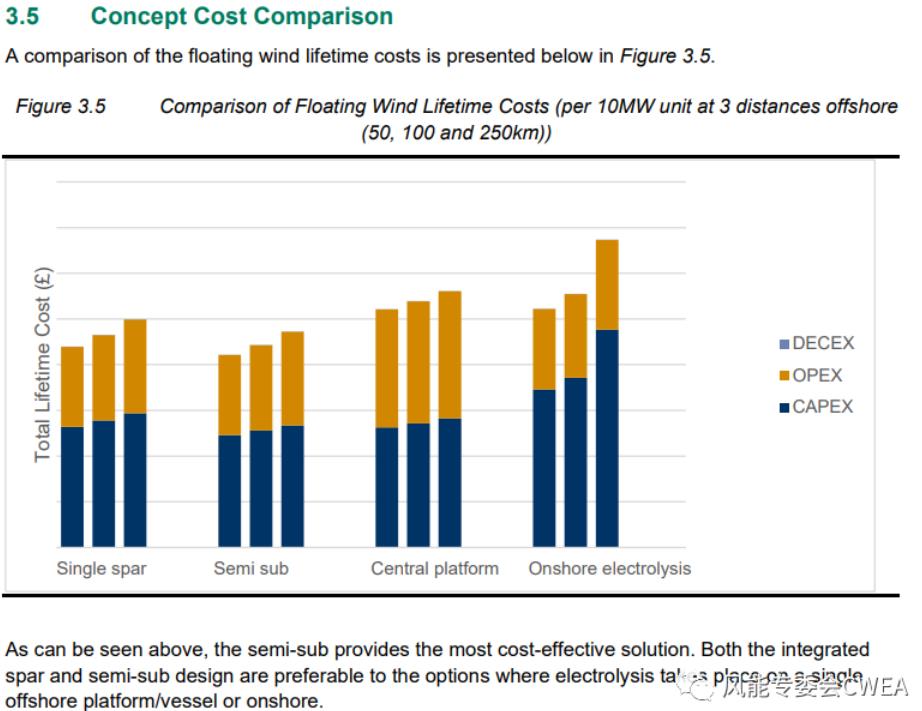 英國另一個名為dubbed Dolphyn 的氫能島項(xiàng)目,計劃使用漂浮式風(fēng)電配合電解槽來進(jìn)行制氫,分別采用一臺2MW和10MW的漂浮式風(fēng)機(jī)。Dolphyn母公司ERM進(jìn)行的一項(xiàng)分析顯示,四種不同裝置的全生命周期成本各不不同。