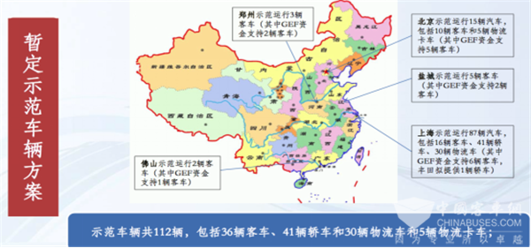 2016年8月31日,由全球環(huán)境基金(GEF)、聯(lián)合國(guó)開(kāi)發(fā)計(jì)劃署(UNDP)支持,科技部、財(cái)政部聯(lián)合北京市、上海市、河南省、廣東省和江蘇省政府共同實(shí)施的“促進(jìn)中國(guó)燃料電池汽車商業(yè)化發(fā)展”項(xiàng)目正式啟動(dòng)(簡(jiǎn)稱GEF三期),分別在北京、上海、佛山、鄭州、鹽城等國(guó)內(nèi)5個(gè)城市,示范運(yùn)行推廣112輛燃料電池汽車,其中包括36輛客車、41輛轎車、30輛物流車和5輛物流卡車。
