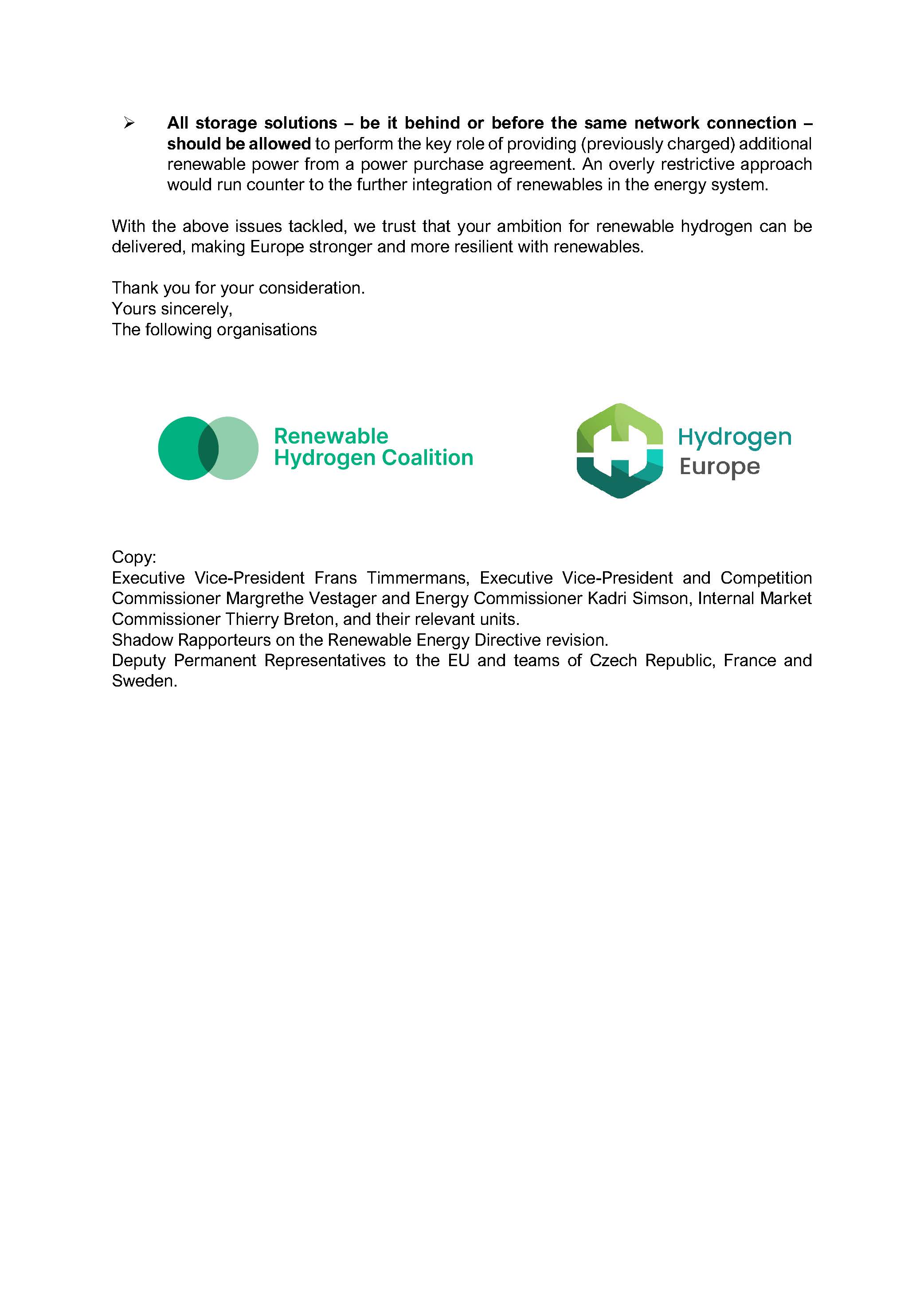 在致歐盟委員會主席烏爾蘇拉·馮德萊恩(Ursula von der Leyen)、捷克共和國工業和貿易部長約澤夫·西凱拉(Jozef Síkela)和歐洲議會議員Markus Pieper的信中,這兩個代表機構表示,通過DA將減少可再生氫的政策不確定性。