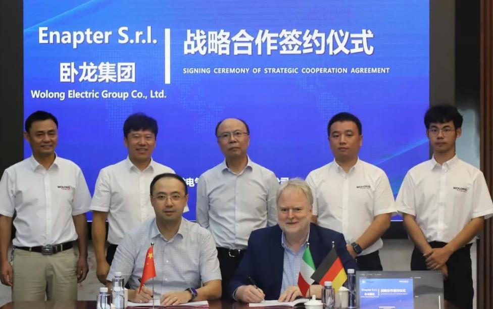 8月7日,臥龍集團與Enapter AG簽署戰略合作協議,雙方將聯合推動電解槽中國實現產業化發展,這是兩家企業繼今年3月份簽訂合作備忘錄以來的重要里程碑。臥龍集團董事局主席陳建成見證簽約,Enapter創始人、總裁Sebastian-Justus Schmidt,臥龍電驅集團董事長龐欣元代表雙方簽約。