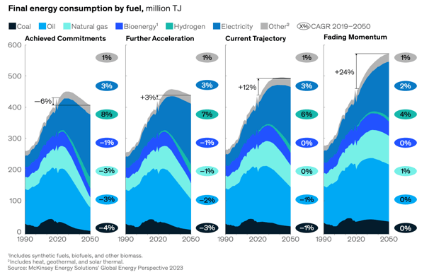 盡管挑戰重重,報告仍預測,在各種能源轉型方案的推動下,預計到2025年,電力和氫氣在最終能源消耗中的比例將達到27%-27%,到2050年將達到35%-60%。盡管化石燃料需求預計在2030年達到峰值,但在大多數情況下,到2040年的天然氣總需求預計會增加。