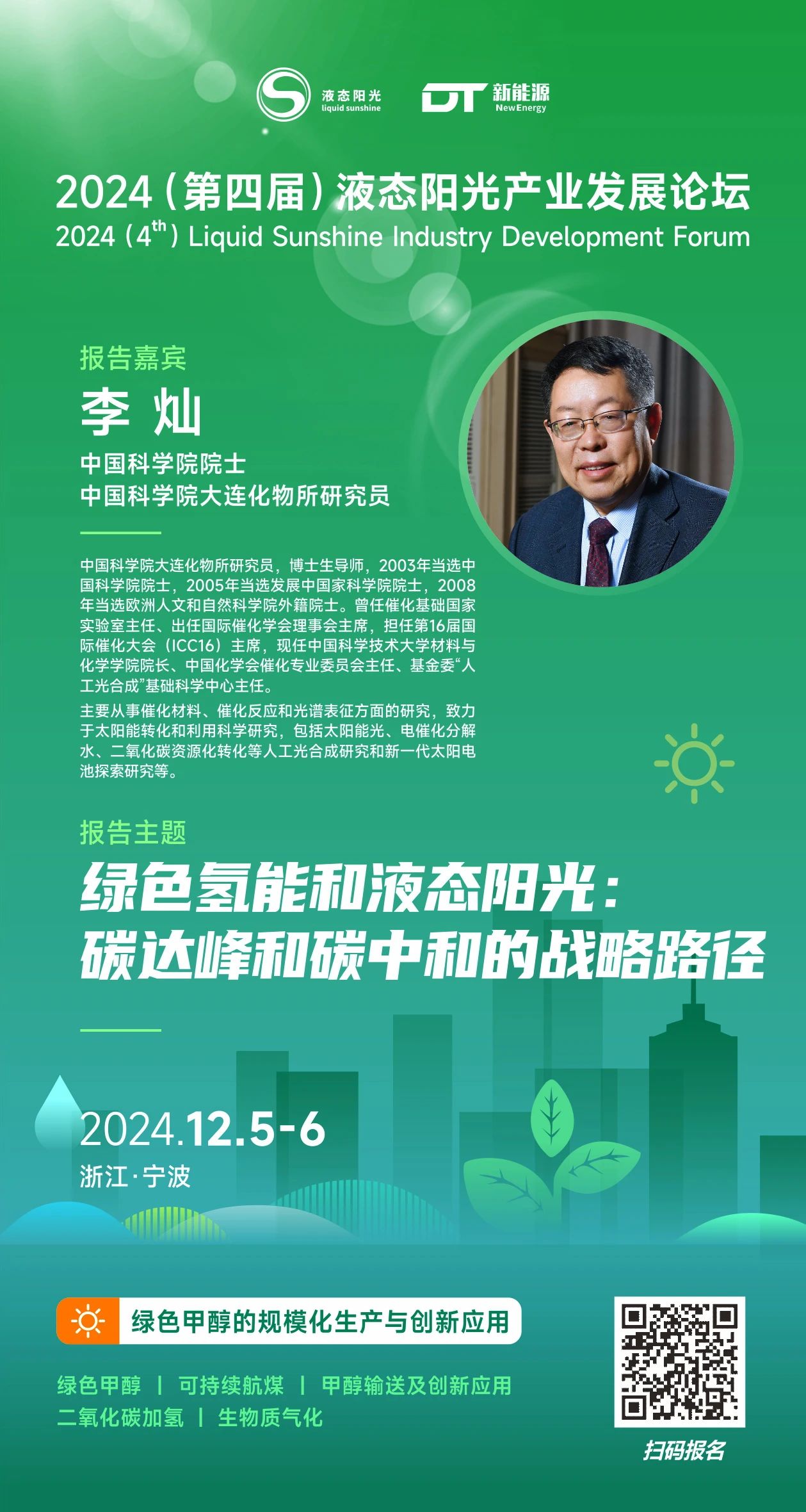 液態(tài)陽(yáng)光、DT新能源特邀請(qǐng)中國(guó)科學(xué)院院士、中國(guó)科學(xué)院大連化物所研究員 李燦出席2024(第四屆)液態(tài)陽(yáng)光產(chǎn)業(yè)發(fā)展論壇,并作主題報(bào)告《綠色氫能和液態(tài)陽(yáng)光:碳達(dá)峰和碳中和的戰(zhàn)略路徑》。