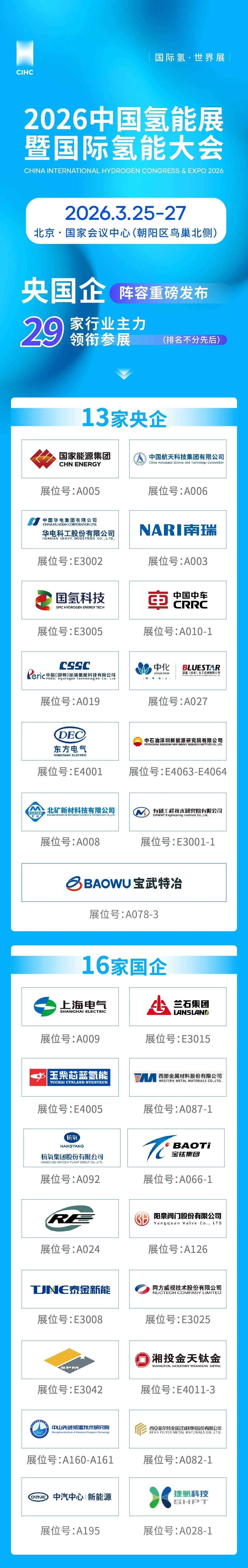 CIHC 2026中國(guó)氫能展由中國(guó)氫能聯(lián)盟、中國(guó)電力企業(yè)聯(lián)合會(huì)主辦,北京泰格爾展覽有限公司等單位承辦。截至發(fā)稿前,CIHC 2026已吸引了國(guó)家能源集團(tuán)、中國(guó)航天科技集團(tuán)、華電科工、南瑞集團(tuán)、國(guó)氫科技、中國(guó)中車(chē)、中船派瑞氫能、藍(lán)星北化機(jī)、中石油深圳院所、北礦新材、上海電氣、蘭石集團(tuán)、玉柴氫能、杭氧、稀奧科、捷氫科技等央國(guó)企,挪威、沙特、鄂爾多斯、廈門(mén)、香港機(jī)電工程署、青島氫能產(chǎn)業(yè)園等展團(tuán),以及陽(yáng)光氫能、隆基氫能、雙良?xì)淠堋|緯氫能、天合元?dú)洹⒋箨懼茪?、索科曼正卓、氫晨科技、浙江嘉化、TüV 萊茵、必維國(guó)際、博世、考克利爾競(jìng)立、英特利、偉創(chuàng)電氣、幕帆動(dòng)力、TüV南德、保時(shí)來(lái)等覆蓋氫能全產(chǎn)業(yè)鏈的眾多國(guó)內(nèi)外頭部企業(yè),展覽面積超50000平方米。