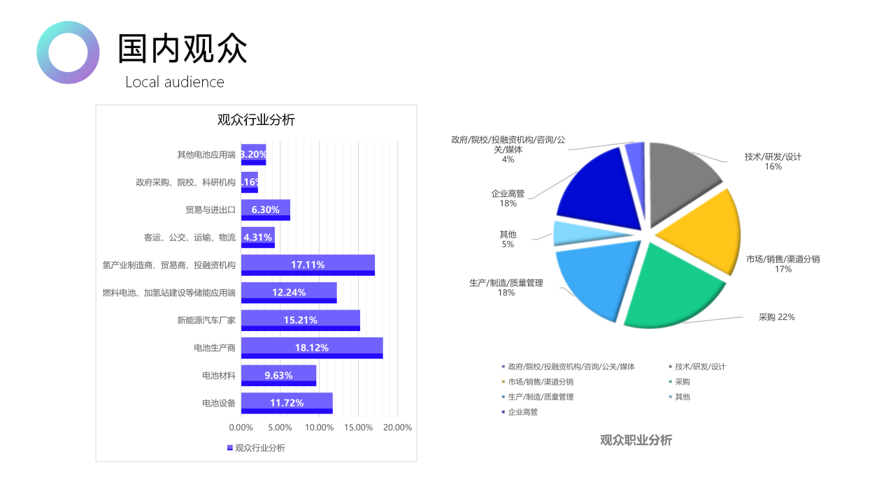 本屆博覽會:氫能+鋰電總規(guī)模達10萬㎡,1500余家展商,吸引來自全球電池與儲能、氫能燃料電池上下游產(chǎn)業(yè)鏈企業(yè)、材料設(shè)備企業(yè)供應(yīng)鏈企業(yè)、汽車、交通、電力、能源等領(lǐng)域的13.75萬人次專業(yè)觀眾蒞臨現(xiàn)場參觀,海外觀眾達8731人,旨在打造全球氫能燃料電池行業(yè)最具影響力世界級技術(shù)交流與展貿(mào)平臺。本屆展會以制氫技術(shù)、氫氣儲運、燃料電池系統(tǒng)與部件、燃料電池應(yīng)用、加氫站技術(shù)為核心,通過對氫能及燃料電池、行業(yè)應(yīng)用產(chǎn)品、設(shè)備、電池產(chǎn)業(yè)應(yīng)用端的全產(chǎn)業(yè)鏈展示,促進氫能與燃料電池產(chǎn)業(yè)的進一步發(fā)展,推動與全球氫能與燃料電池產(chǎn)業(yè)包括汽車、能源、電力、材料等行業(yè)之間的信息交流與合作。