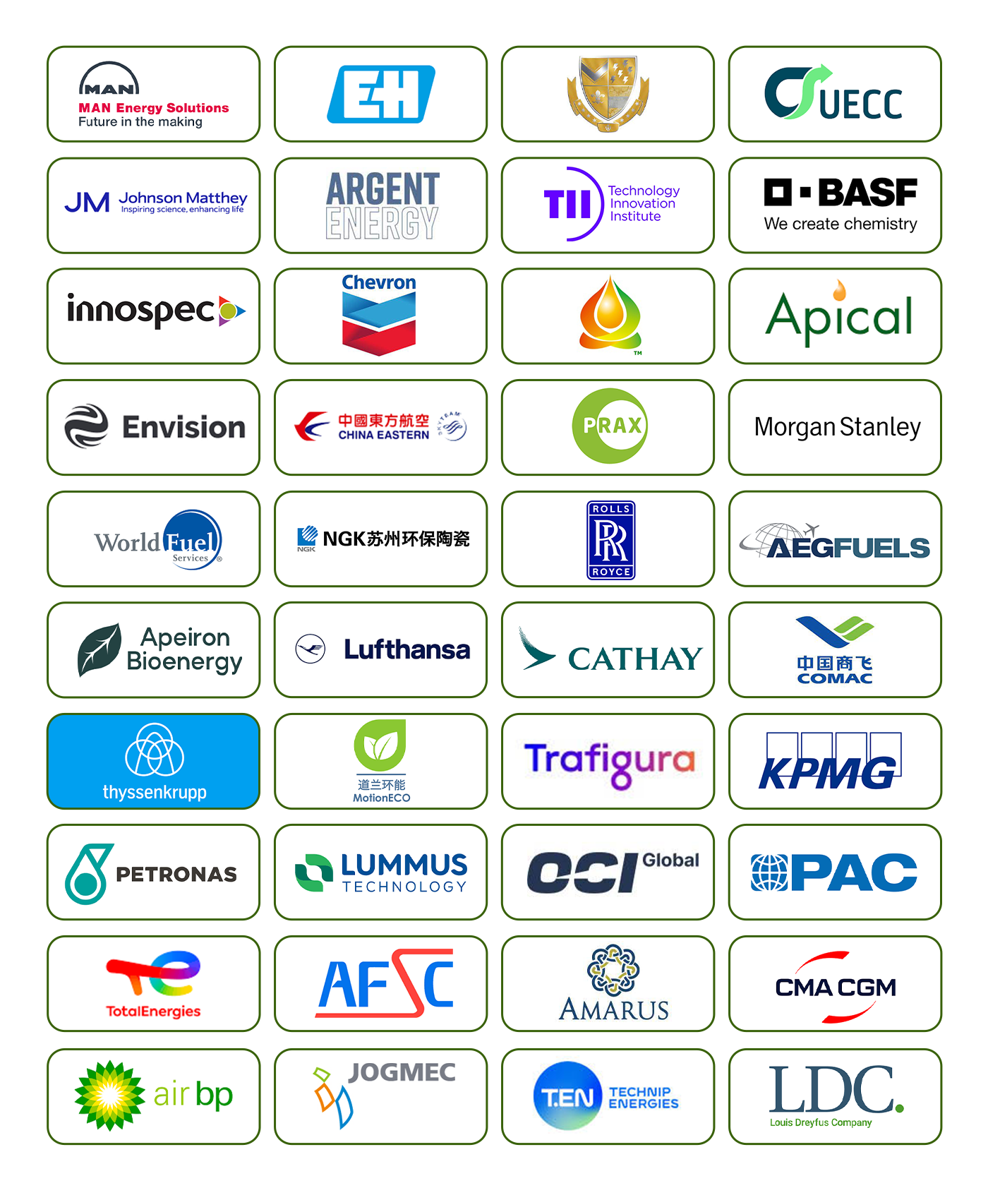 中國民航局航油航化適航審定中心、通用電氣航空航天公司、德博能源、德勤、西門子能源、霍尼韋爾UOP、中國船舶集團有限公司、中石化石油化工科學研究院、挪威船級社、波音、中國質量認證中心、Axens、SEA-LNG