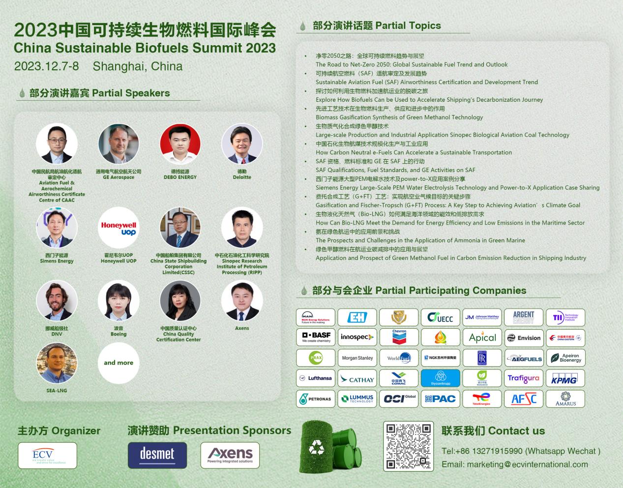 由上海希為(ECV International)主辦的“2023中國可持續生物燃料國際峰會”即將于2023年12月7日-8日在上海拉開帷幕,峰會采用“線下+線上”的方式同步進行,中英雙語同聲傳譯,線上、線下并行進行和實時互動。歡迎咨詢、運輸行業、氫化植物油/低碳燃料、可持續航空燃料/生物航煤、可再生原料、生物燃料/生物柴油、合成燃料、電子燃料、液化和氣化解決方案、催化解決方案、轉化工藝、精煉解決方案、預處理和凈化解決方案、工程解決方案、石油和天然氣、能源和石化等行業領域的利益相關者報名出席峰會。