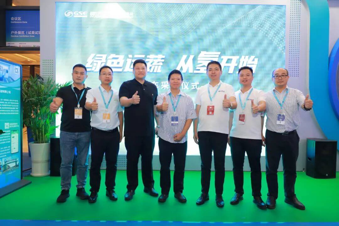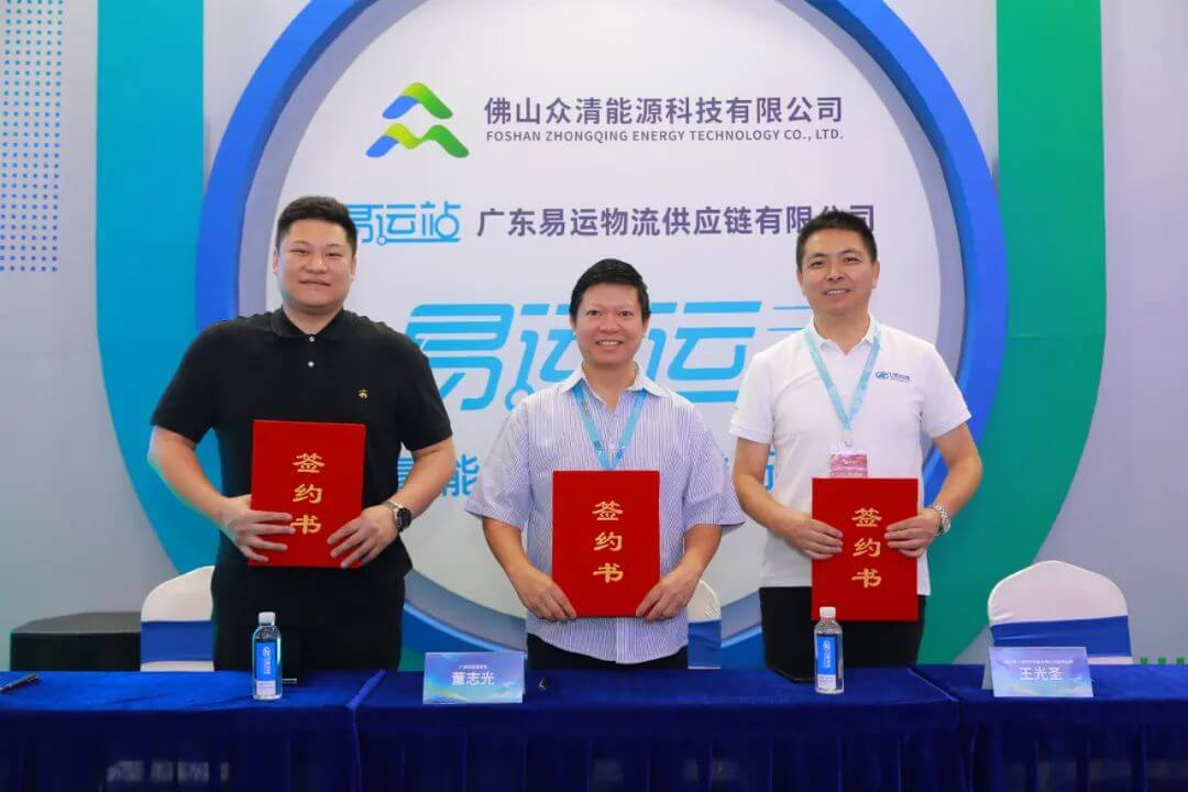 展會期間還舉辦了“綠色運蔬 從氫開始”百車采購協議”簽約儀式,廣東易運物流供應鏈有限公司副總經理劉晉延、物流供應鏈事業部總監何偉輝,廣順集團董事長董志光,飛馳科技副總經理王光圣等企業領導出席簽訂儀式。此次協議的簽訂,一方面旨在貫徹落實《廣東省加快氫能產業創新發展的意見》,以氫能應用場景推動“制、儲、運、用”全產業鏈條發展,利用《綠色運蔬》農貿物流園應用場景,推廣應用氫能冷鏈運輸車,另一方面三方將共同組織優勢資源,以燃料電池示范城市群應用為結合點,在廣東示范城市群地區共同合作推廣100輛飛馳牌4.5T燃料電池冷藏運輸車。《百車采購協議》的簽署給氫能物流運輸車應用端帶來創新的合作運營模式,同時本次簽約是《綠色運蔬》項目落地中最為重要的環節,也是三方打造廣東省氫能應用示范園重要的第一步。