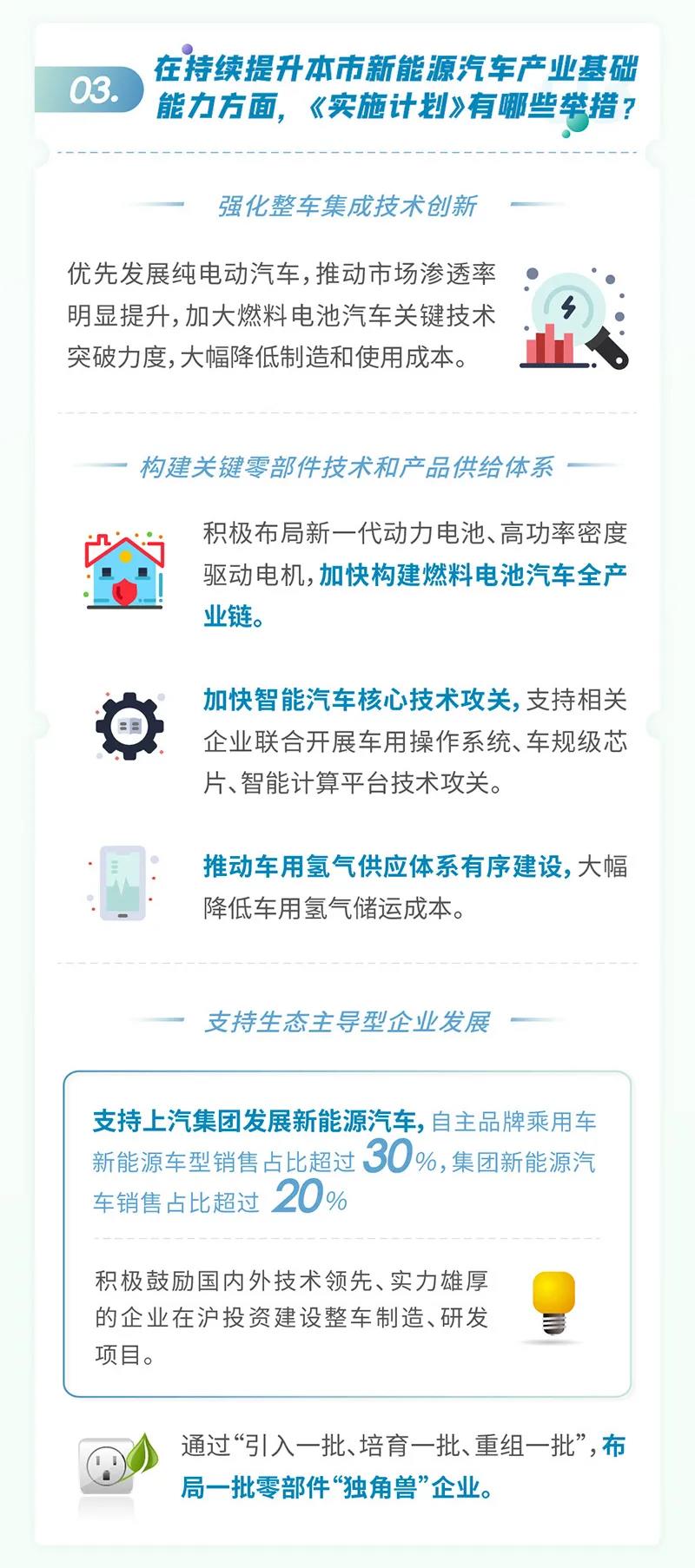 《實施計劃》還提出,支持生態主導型企業發展。支持上汽集團發展新能源汽車,至2025年,自主品牌乘用車新能源車型銷售占比超過30%,集團新能源汽車銷售占比超過20%。通過“引入一批、培育一批、重組一批”,打造若干銷售規模達到百億級的“獨角獸”企業。