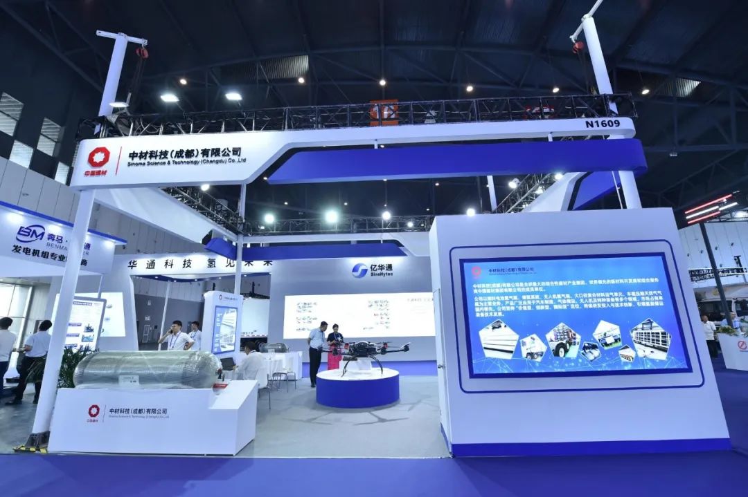 中材科技(成都)有限公司現場展示了385L大容積車用燃料電池儲氫氣瓶和無人機儲氫氣瓶。