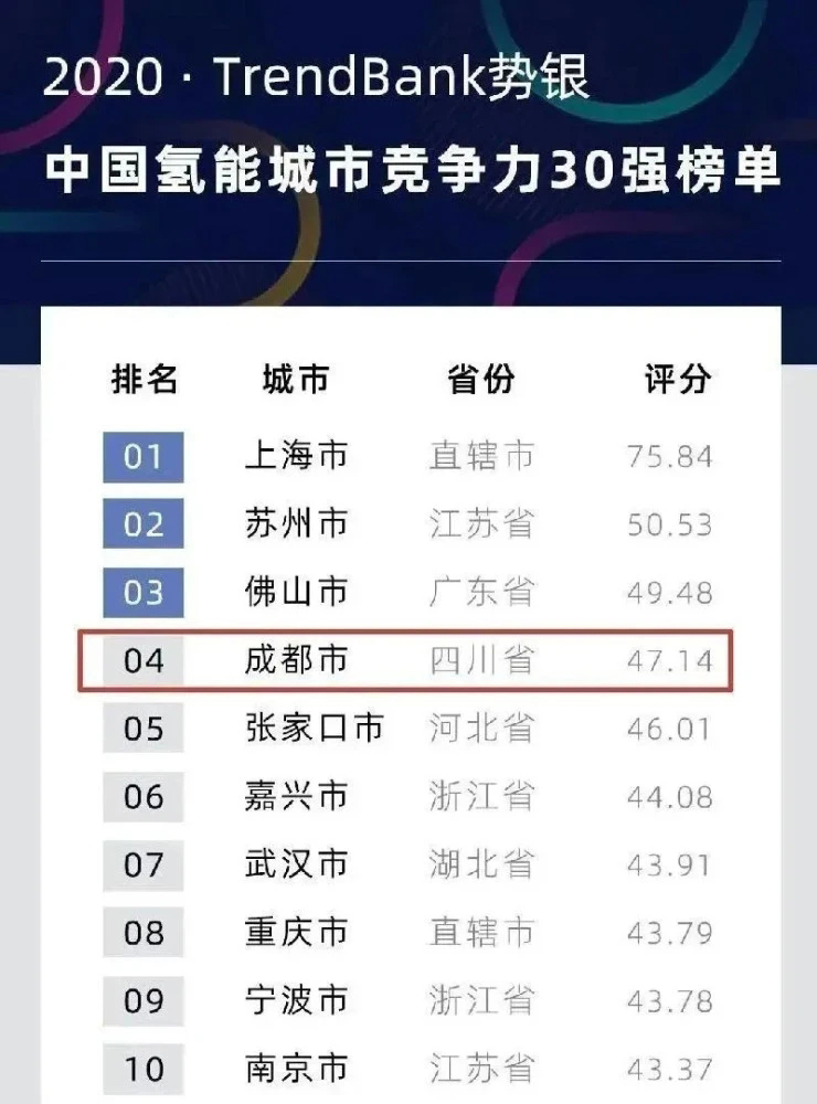 由于扎實(shí)的產(chǎn)業(yè)基礎(chǔ),成都入圍2020年《中國氫能城市競爭力30強(qiáng)榜單》前四強(qiáng),與重慶一道,是西部地區(qū)僅有的2名上榜城市。