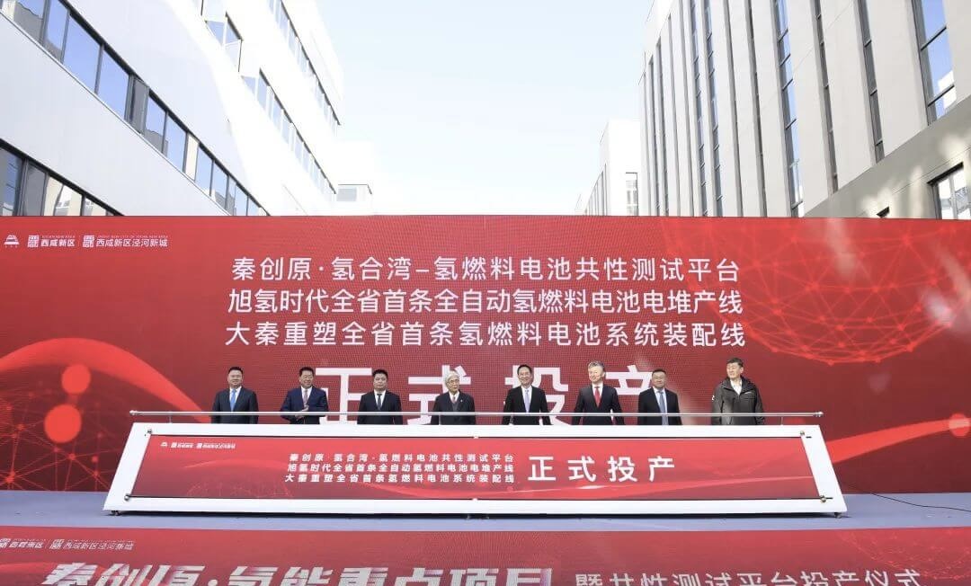 11月17日上午,秦創原·氫能重點項目暨共性測試平臺投產儀式在涇河新城智造創新產業園隆重舉行,作為陜西省首個以氫燃料電池為核心的產業化示范項目,旭氫時代西北首條全自動化氫燃料電池堆生產線正式投產。中國科學院院士、西安交通大學能動學院教授陶文銓,西咸新區黨工委書記楊仁華,陜西省委科技工委委員、省科技廳副廳長王軍,西咸新區黨工委委員、管委會副主任陳輝,西咸新區黨工委委員、涇河新城黨委書記張宏偉,涇河新城黨委副書記、管委會主任薛峰、陜西旭氫時代科技有限公司董事長王海峰、陜西大秦重塑能源科技有限公司常務副總經理夏長虹及相關企業、金融機構代表出席本次活動。