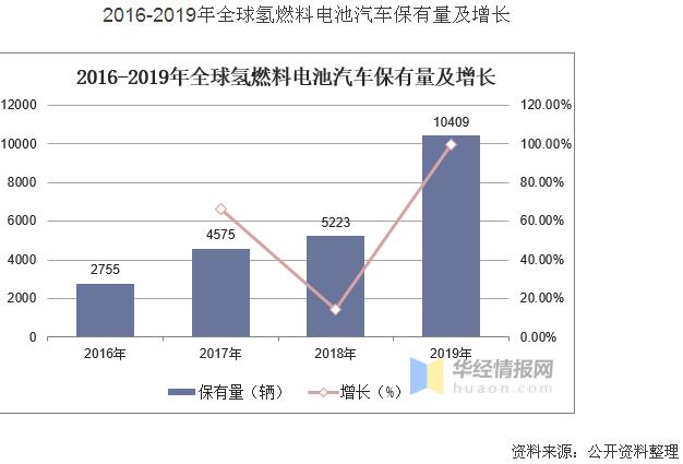 從全球氫燃料電池汽車保有量來看,據(jù)統(tǒng)計(jì),2019年全球氫燃料電池汽車保有量增長至10409輛,同比2018年增長99.29%。