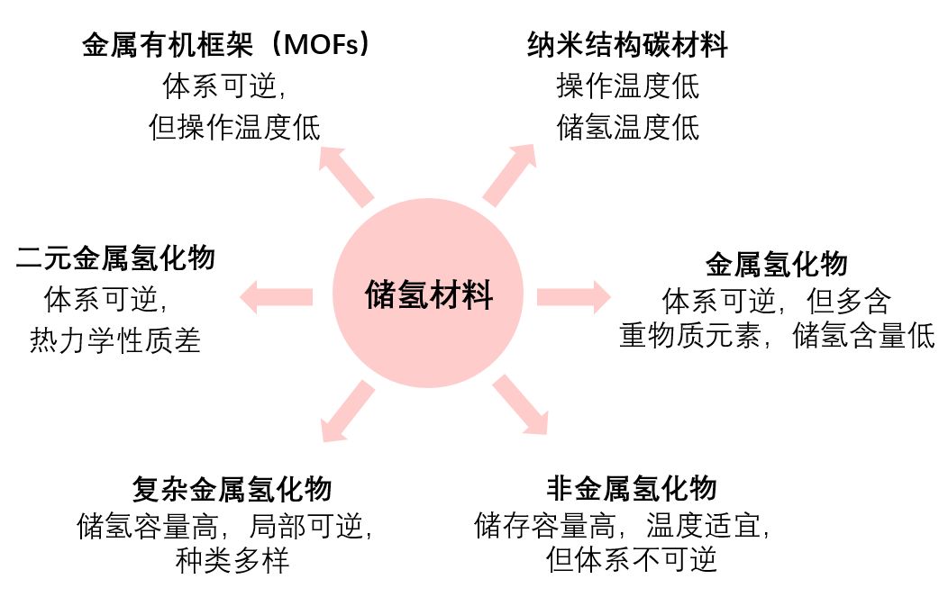 固體材料儲(chǔ)氫主要是利用氫氣與儲(chǔ)氫材料之間發(fā)生物理或者化學(xué)變化從而轉(zhuǎn)化為固溶體或者氫化物的形式來(lái)進(jìn)行氫氣儲(chǔ)存。儲(chǔ)氫材料種類非常多,主要可分為物理吸附儲(chǔ)氫和化學(xué)氫化物儲(chǔ)氫。其中物理吸附儲(chǔ)氫又可分為金屬有機(jī)框架(MOFs)和納米結(jié)構(gòu)碳材料,化學(xué)氫化物儲(chǔ)氫又可分為金屬氫化物(包括簡(jiǎn)單金屬氫化物和復(fù)雜金屬氫化物),非金屬氫化物(包括硼氫化物和有機(jī)氫化物)。