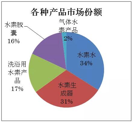 水素水(罐裝,袋裝)在銷售總額中占最大份額(34%),其次是水素生成器(31%),近年洗浴用水素產(chǎn)品出現(xiàn)很多,占17%,再有就是水素膠囊,近兩年急速發(fā)展,已達(dá)到16%。氣體水素產(chǎn)品在2016年占的份額不多,只有約2%。