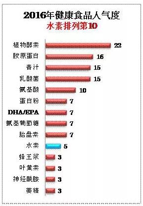 固體水素在2016年的健康食品和化妝品中的人氣度,都進(jìn)入了前10名,水素?fù)屨冀】凳称返?0位,在化妝品中水素已經(jīng)占據(jù)了第4位。