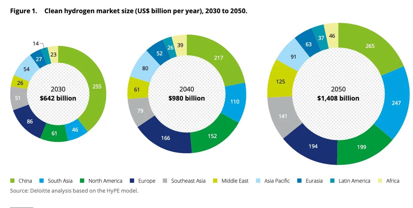 氫啟未來網(wǎng)消息,根據(jù)德勤的最新研究,到2050年,全球氫能市場的規(guī)模可能增加一倍多,達(dá)到每年1.4萬億美元。
