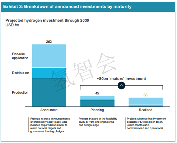 如果所有項(xiàng)目都取得成果,到2030年,總投資將超過3000億美元的氫能支出 — 相當(dāng)于全球能源資金的1.4%。 然而,目前這項(xiàng)投資中只有800億美元可以認(rèn)為是"成熟"的,這意味著投資要么處于規(guī)劃階段,要么已通過最終投資決定(FID),要么與正在建設(shè)、已經(jīng)委托或運(yùn)營(yíng)的項(xiàng)目有關(guān)。