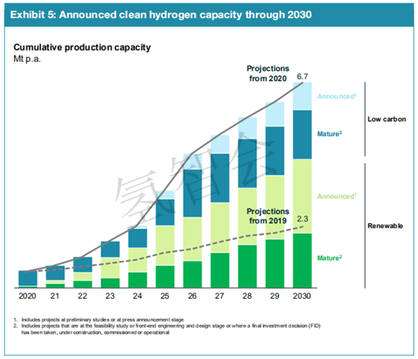 由于對(duì)氫的關(guān)注日益增加,加上政府的支持不斷增加,宣布的2030年清潔氫的產(chǎn)能由先前的230萬噸增至每年670萬噸。 換句話說,過去一年,玩家已經(jīng)宣布了三分之二的清潔氫氣產(chǎn)能。