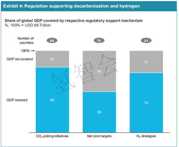 各國(guó)政府計(jì)劃支持向氫能轉(zhuǎn)型的戰(zhàn)略,將投入700億美元。 政府支持的增加源于全球轉(zhuǎn)向去碳化:75個(gè)國(guó)家占世界GDP的一半,凈零野心,80%的全球GDP由某種水平的二氧化碳定價(jià)機(jī)制覆蓋。