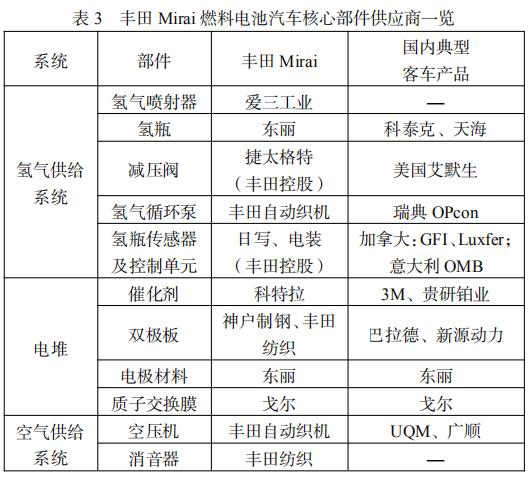 日本在燃料電池汽車方面領先全球,不止在于技術優 勢,還在于其強大的供應鏈體系,以豐田 Mirai 燃料電池核 心部件為例,如表 3 所示,其電堆、氫氣供給系統、空氣供 給系統的主要供應商基本為本土企業,其中電裝、豐田自動 織機、愛信精機、豐田紡織、捷太格特主要供應商均為豐田 公司控股企業。而國內典型客車產品核心部件的供應商主要 集中于歐美日等國,國內企業目前主要從事電堆集成、電堆 系統集成、氫氣供應系統集成的工作。